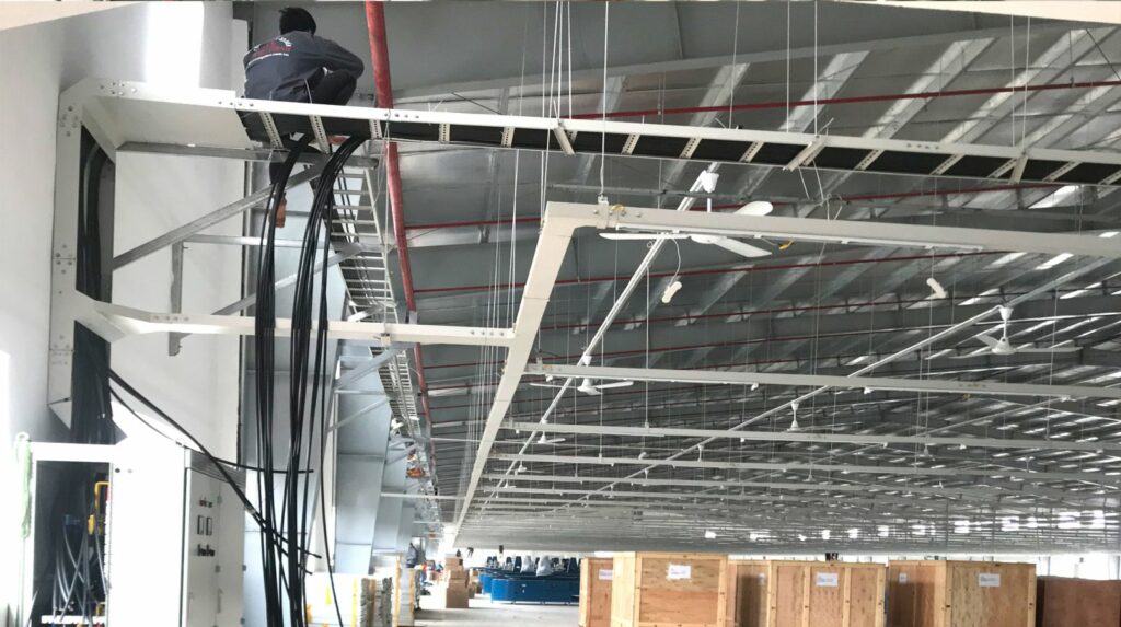 Lắp đặt thang cáp, máng cáp, ống luồn; kéo và đấu nối cáp điện lực, cáp điều khiển toàn bộ công trình nhà xưởng.